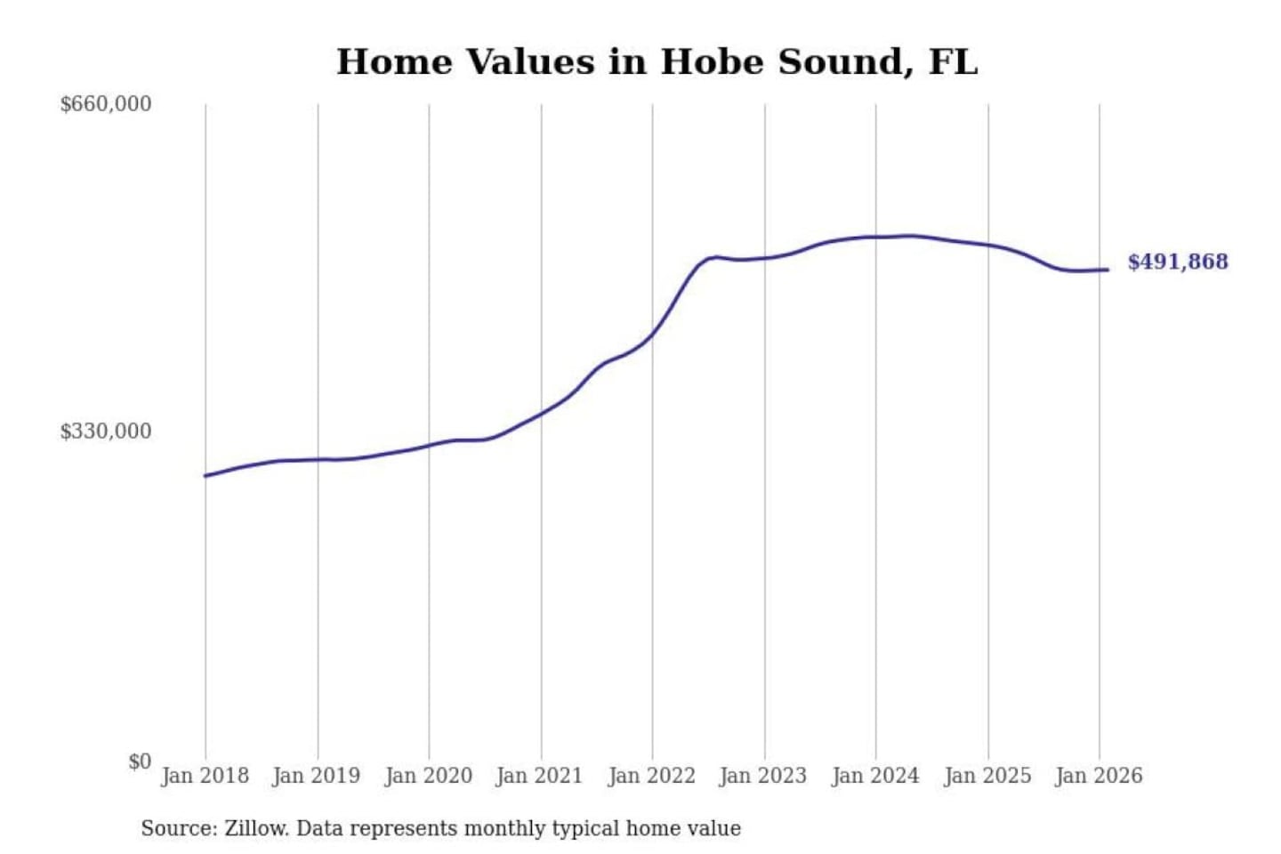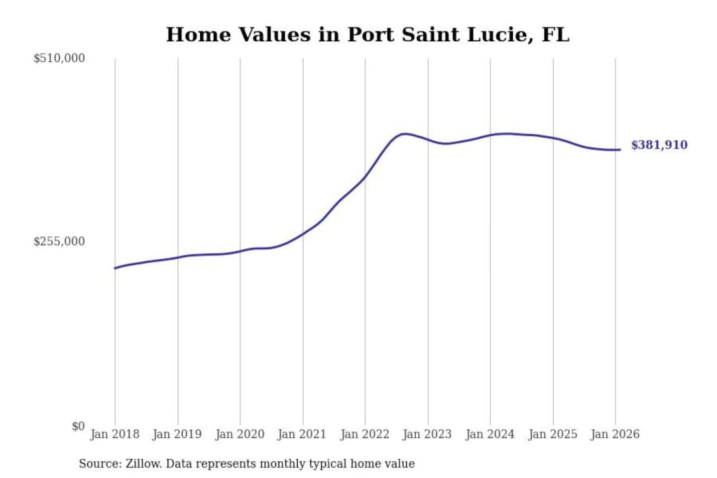 Stacker compiled a list of cities with the most expensive homes in the Port St. Lucie, FL metro area using data from Zillow. Charts show the monthly typical home value since January 2018.
