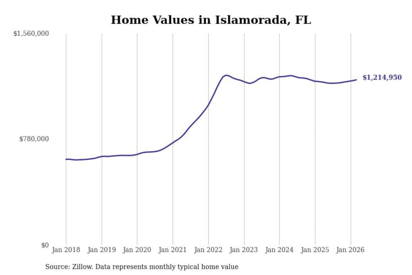 Stacker compiled a list of cities with the most expensive homes in Florida using data from Zillow. Cities are ranked by the Zillow Home Values Index for all homes as of March 2026. The charts in this story were created automatically using Matplotlib.