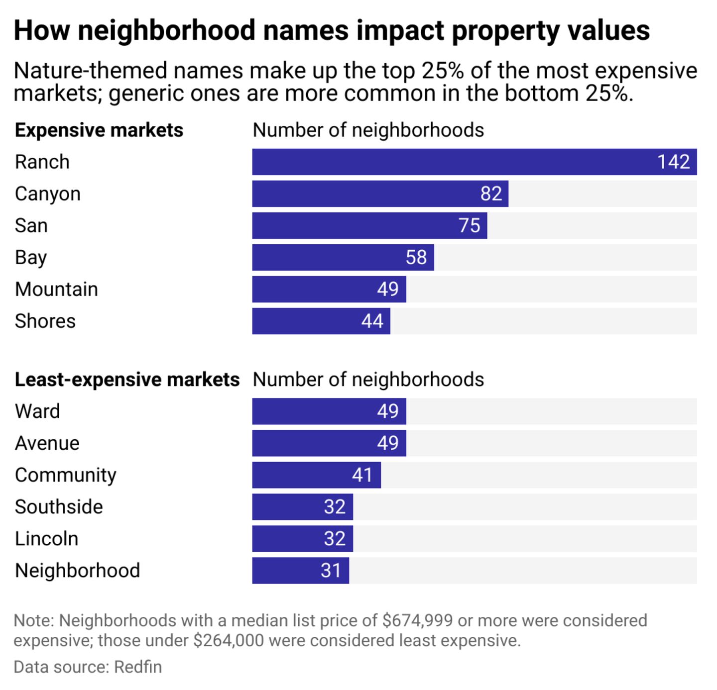 There are similar conclusions for neighborhood names. An analysis of Redfin data revealed that areas with names associated with nature—Ranch, Canyon, Mountain—comprise the top 25% of the most expensive real estate markets. You can see a clear economic difference between neighborhoods with those kinds of names (the existing homes in "Hope Ranch" in Santa Barbara, California, for example, tend to start at $3 million or more) and more generic-sounding neighborhoods, like Chicago's South Side, which has high poverty rates, specifically in areas with dense Black and Brown populations, highlighting a stark socioeconomic divided.