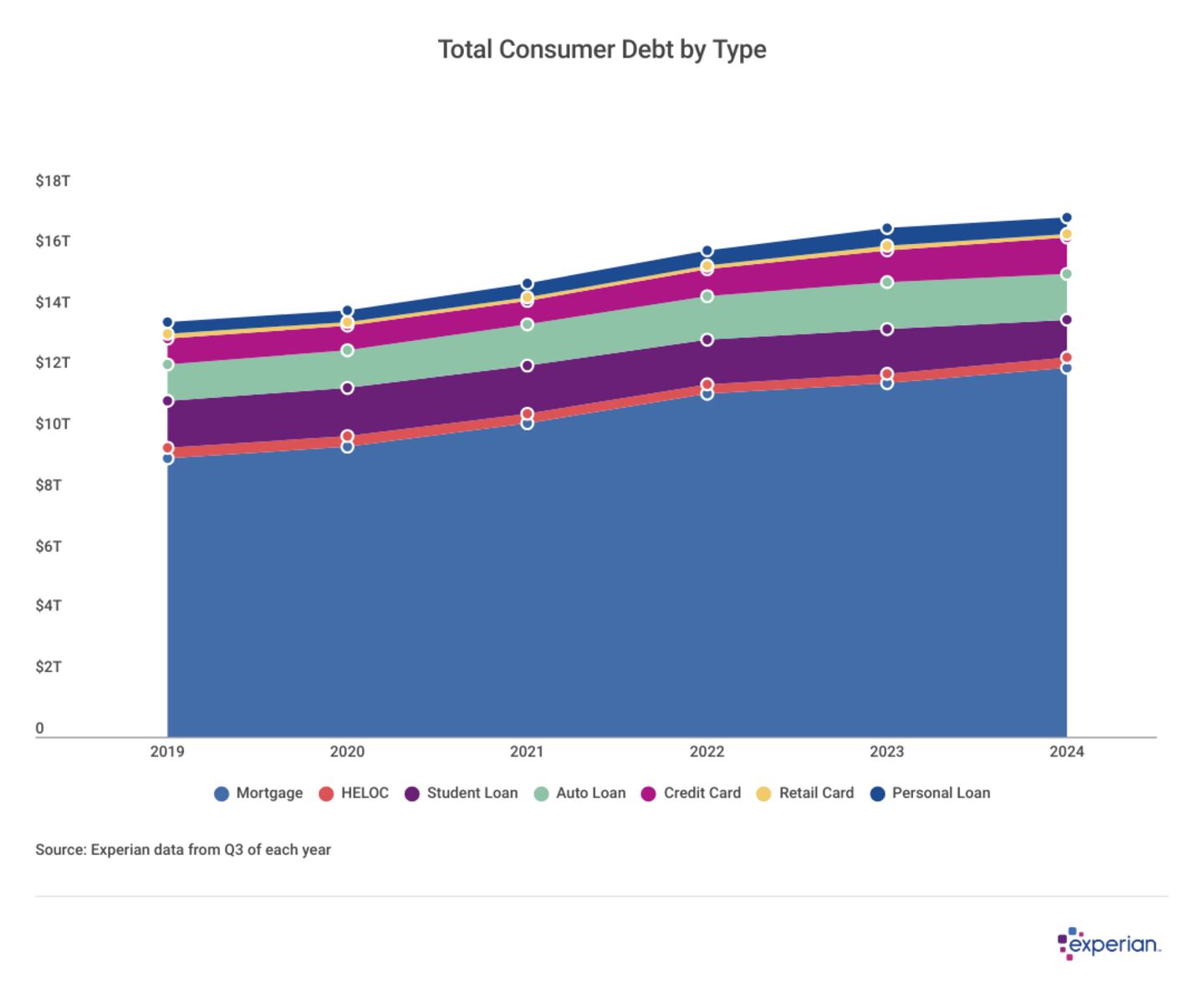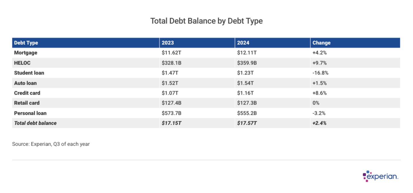 Consumers in the United States owed $17.57 trillion in total debt as of the third quarter (Q3) of 2024, according to Experian data. That's a 2.4% increase from the $17.15 trillion total Experian measured in Q3 2023.