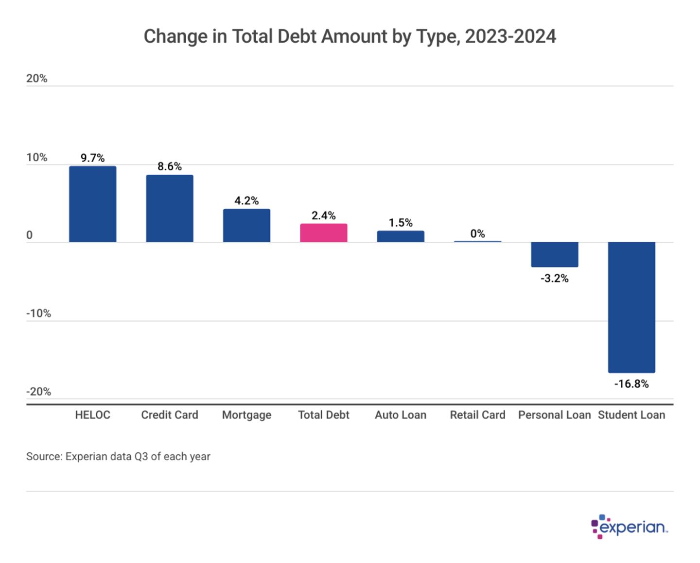 In total dollar terms, most increases came in those types of debt backed by property, such as a home or vehicle. Credit card debt, most of which is not secured by an asset, also saw a sizable increase. Meanwhile, student loan borrowers owe less total debt than they did in 2023, thanks chiefly to student loan forgiveness becoming a reality for some borrowers.
