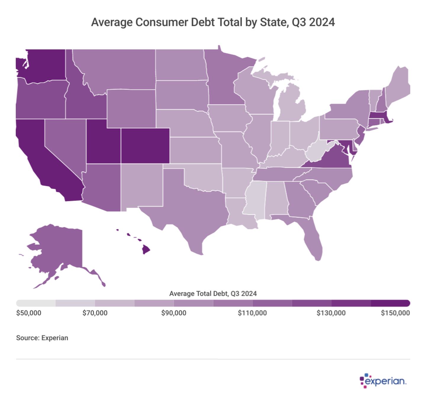 There were declines of 1% or more in some states, primarily in the Midwest, including Ohio and Michigan. In the few states where average consumer debt increased by more than 2% from 2023, such as California, Massachusetts and Utah, average mortgage balances in excess of $300,000 likely drove up averages more sharply. However, this is largely a year where average debt balances plateaued after several years of sharp increases among nearly every type of consumer debt.
