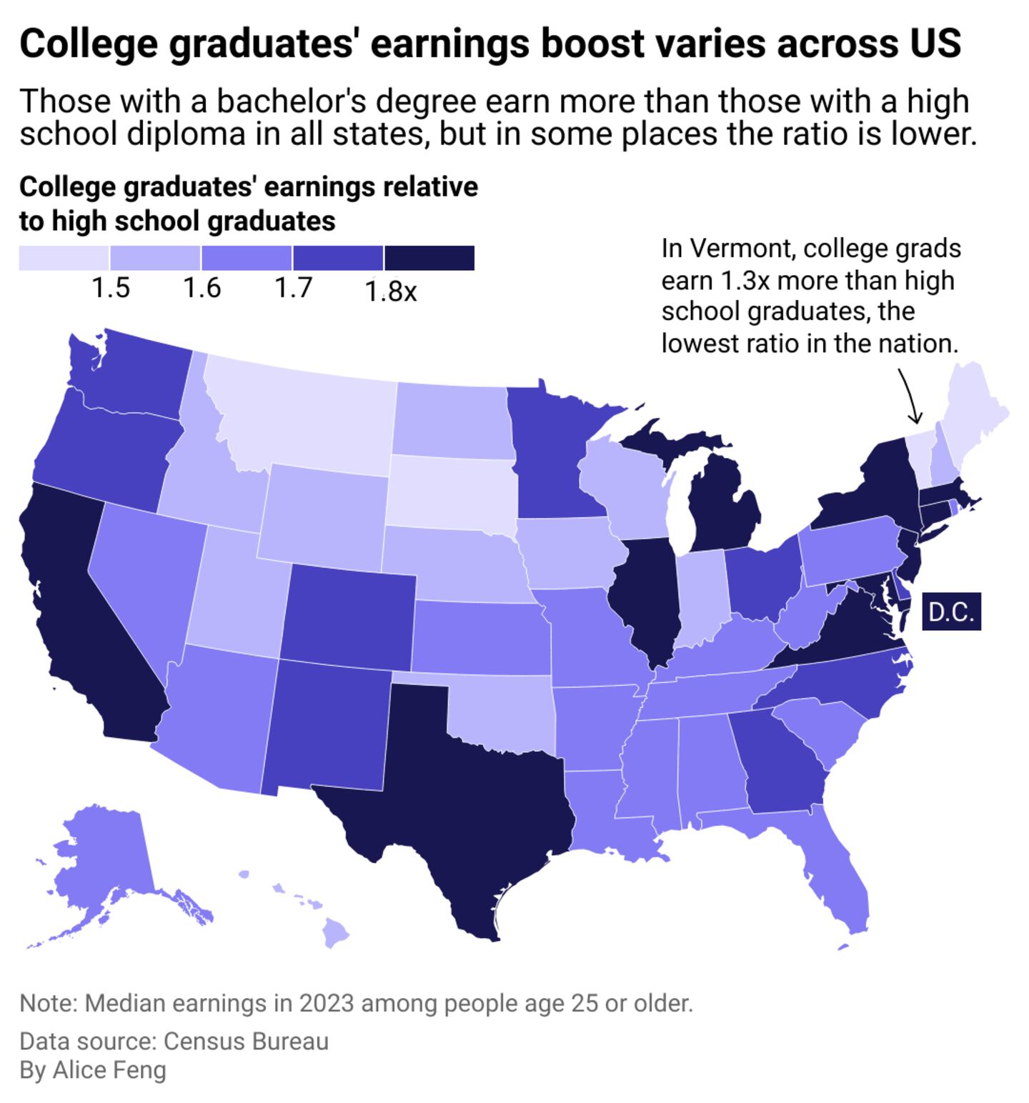 Vermont, on the other hand, forecasts its future job openings will mainly be for waitstaff, carpenters, sales representatives, and fitness trainers—these jobs are ones that do not typically require a bachelor's degree. Without strong local demand for their skills and knowledge, it makes sense that college graduates would not earn as much in states like Vermont.