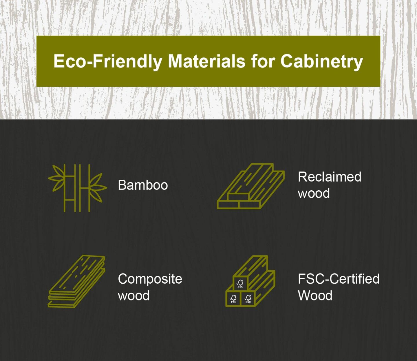 - Composite wood: Composite wood products like particleboard, medium-density fiberboard (MDF) and oriented strand board (OSB) are made by compressing wood fibers or particles with adhesives. They're stable, cost-effective materials for cabinets and great eco-friendly alternatives when made with recycled content and certified by organizations like the Forest Stewardship Council (FSC).