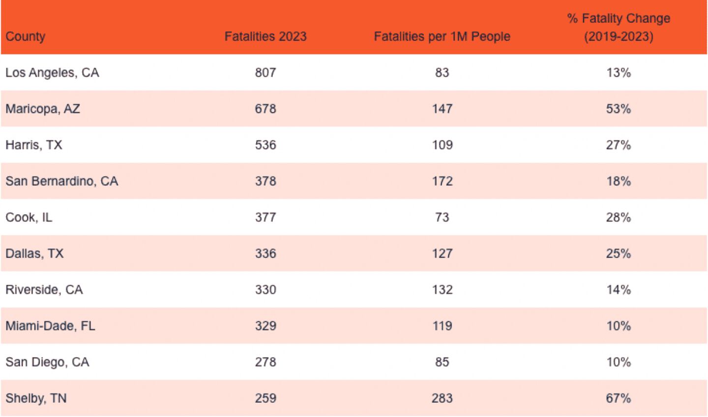 While the most dangerous roads are in large urban areas, there is little correlation between a county’s size and the number of road fatalities—indicating that road design and driving habits are important factors.