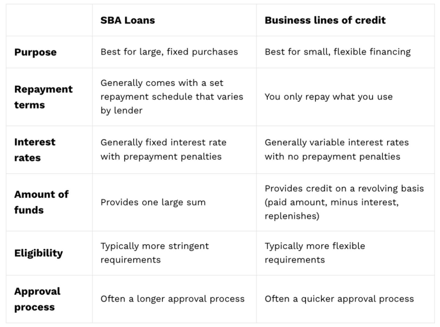 - Eligibility: Evaluate your business's ability to meet the specific requirements of each financing option. While eligibility varies, a business line of credit may have more lenient size and credit requirements compared to an SBA-backed loan.