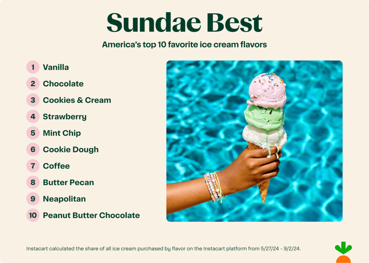 Call it plain or call it a classic, but Vanilla continues its reign as America’s most-ordered ice cream flavor on Instacart in summer 2024. In fact, Vanilla accounted for 27% of all ice cream sold last summer, highlighting its versatility as a base for endless sundae options. Following closely behind are two other familiar favorites: Chocolate and Cookies & Cream.