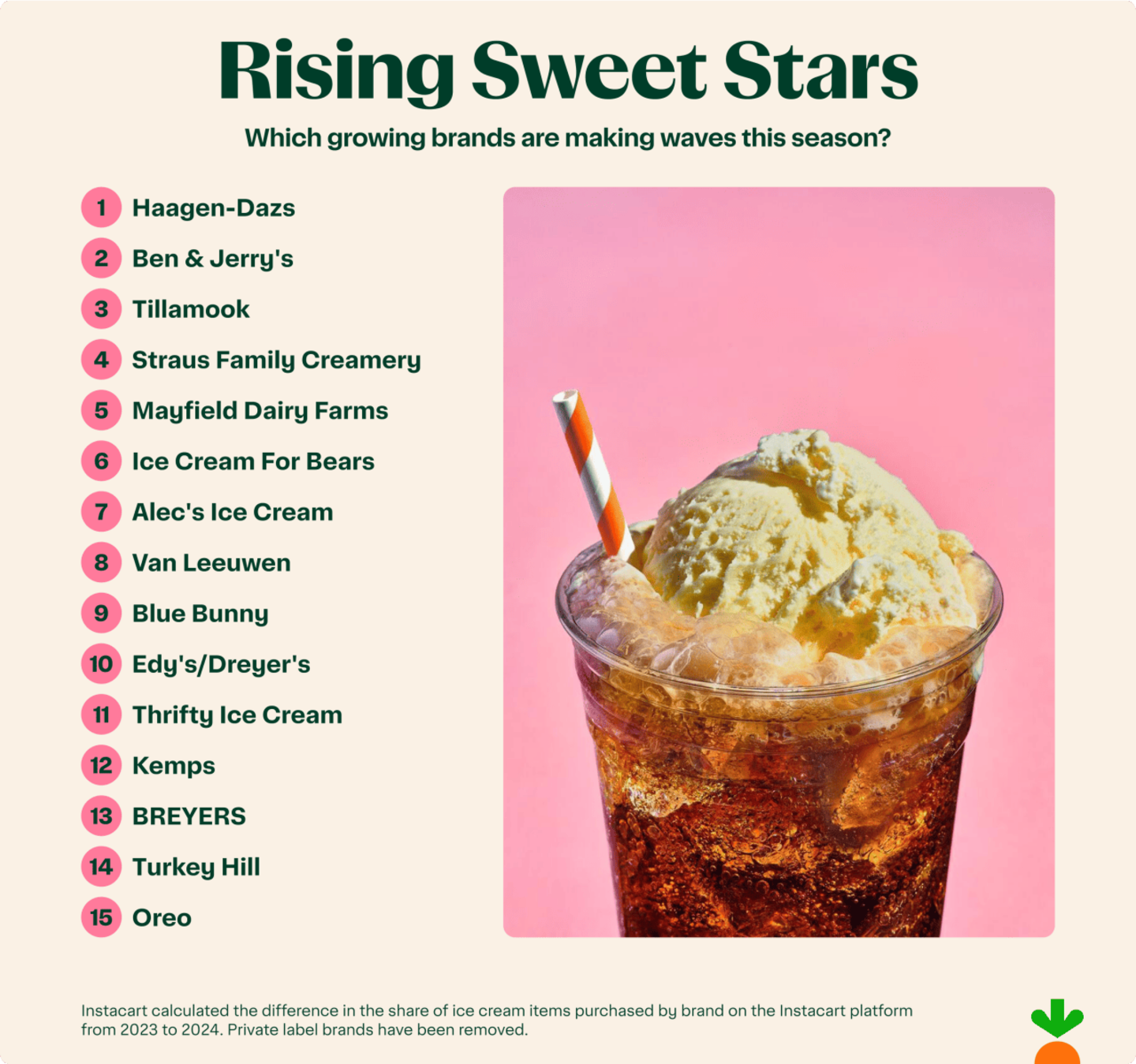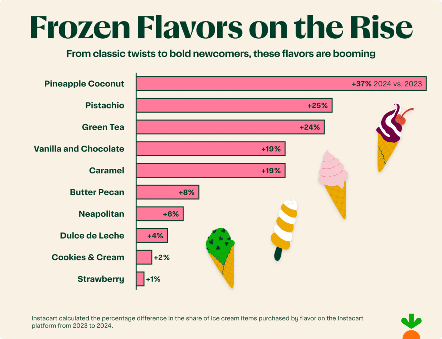 *Methodology: Instacart calculated the share of ice cream orders on the Instacart platform that contained both chocolate ice cream and pistachio ice cream in the same order in 2023 and 2024, then calculated the percentage difference.
