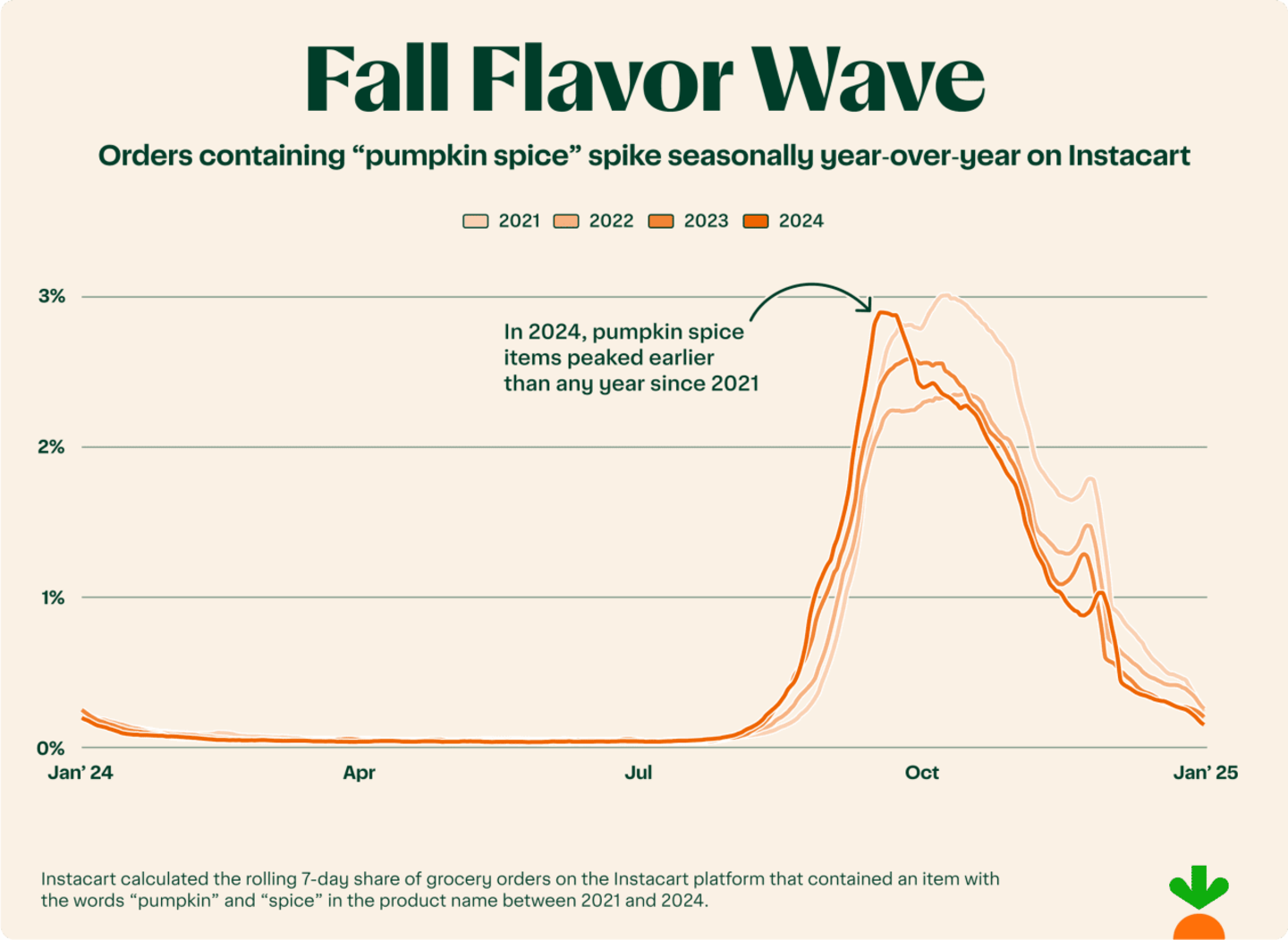 If it feels like pumpkin spice season creeps up earlier every year, you're not imagining it. In 2024, the seasonal peak for orders containing pumpkin spice items occurred on September 17, a full 10 days earlier than in 2023. But this early surge came with a faster cooldown, with demand taking a dip by the end of the month. There's also a reliable second spike in late November, likely driven by Thanksgiving's fondness for all things squash and spice.