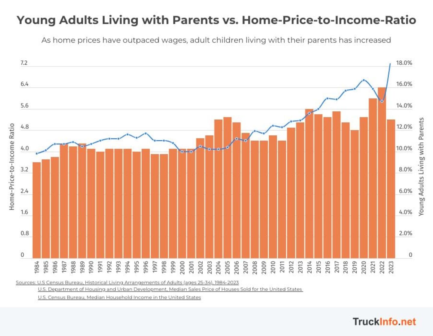 To better understand why and where adult children live with their parents, researchers at TruckInfo.net analyzed data from the U.S. Census Bureau, the Bureau of Labor Statistics, and the Federal Reserve. They found the following trends.