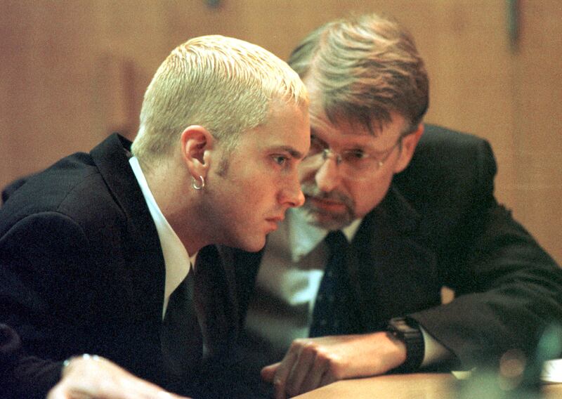 Rapper Eminem, left, consults with his attorney Walter Piszczatowski on June 28, 2001 at Oakland County Circuit Court in Pontiac, MI. He was sentenced to one year of probation on weapons charges. (Photo by Bill Pugliano/Getty Images)