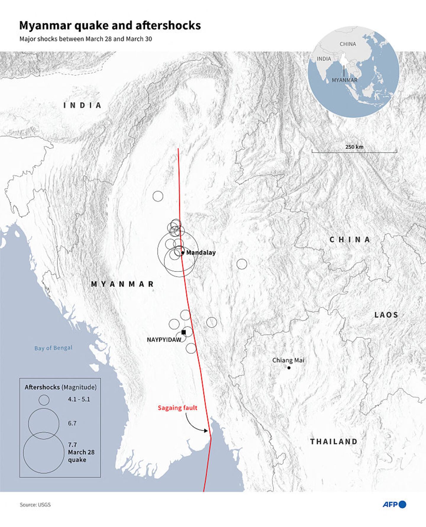 A 7.7 magnitude earthquake rocked Mandalay, Myanmar, on Friday, bringing down hundreds of buildings, including the control tower at the Naypyitaw International Airport and warping roads.