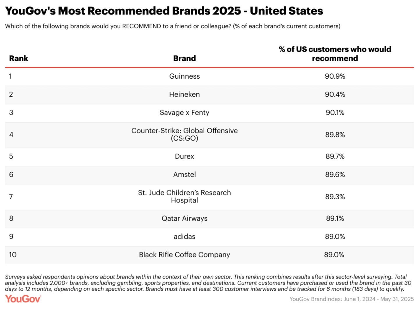 Heineken came in second, with 90% of drinkers saying they’d recommend it, followed by Rihanna’s fashion brand Savage X Fenty, which also scored 90%.